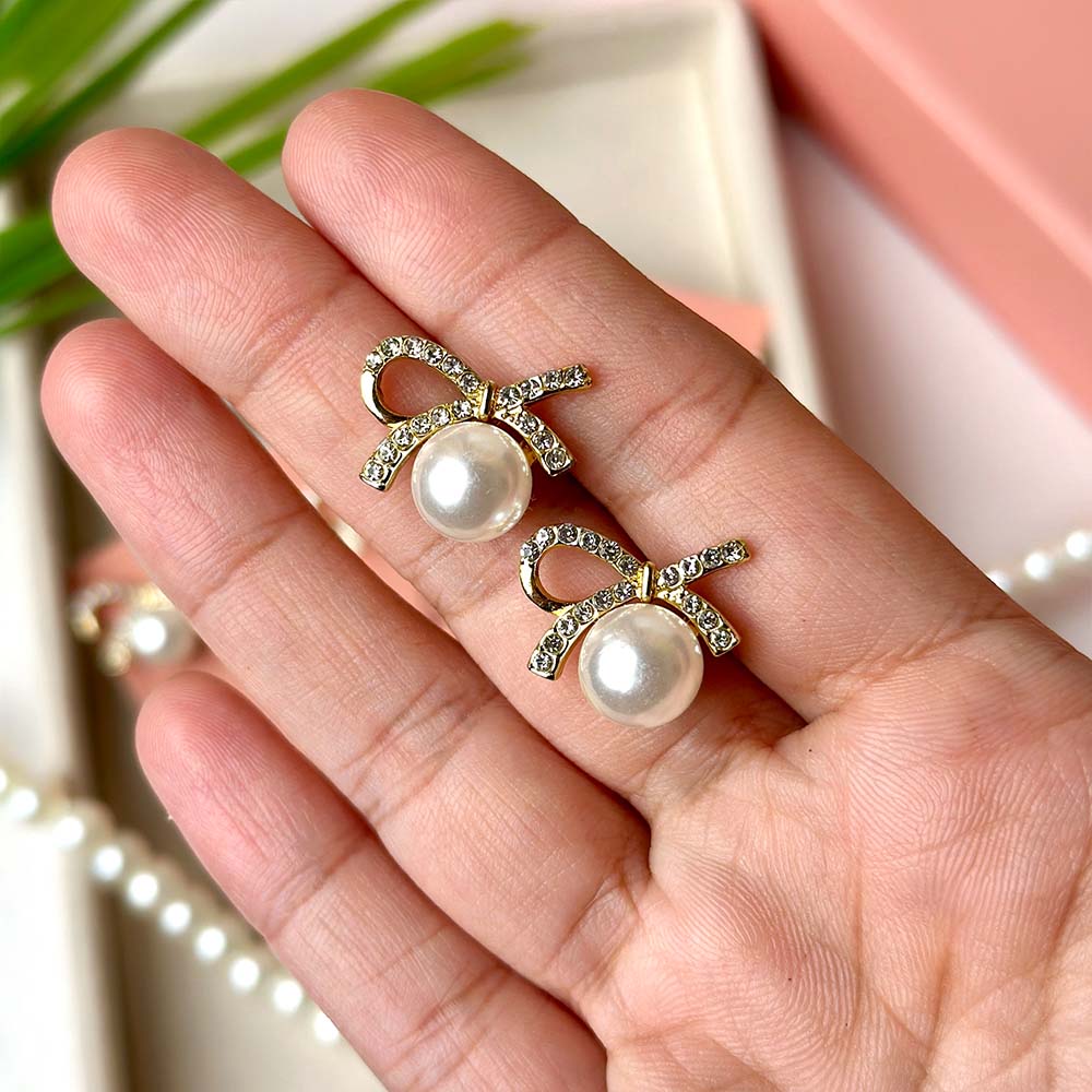 Alloy based, color plated studs with a prominent pearl at bottom and half bow design with small encrusted stones.Experience excellence with our products expect 100% identical, high-quality items as showcased in the pictures. Your satisfaction, our commitment.Preserve your jewelry's beauty keep away from water, perfume, and chemicals. Clean with a soft, dry cloth for lasting shine., color plated studs with a prominent pearl at bottom and half bow design with small encrusted stones. Experience excellence with our products expect 100% identical, high-quality items as showcased in the pictures. Your satisfaction, our commitment. Preserve your jewelry's beauty keep away from water, perAlloy based, color plated studs with a prominent pearl at bottom and half bow design with small encrusted stones. Experience excellence with our products expect 100% identical, high-quality items as showcased in the pictures. Your satisfaction, our commitment. Preserve your jewelry's beauty keep away from water, per
